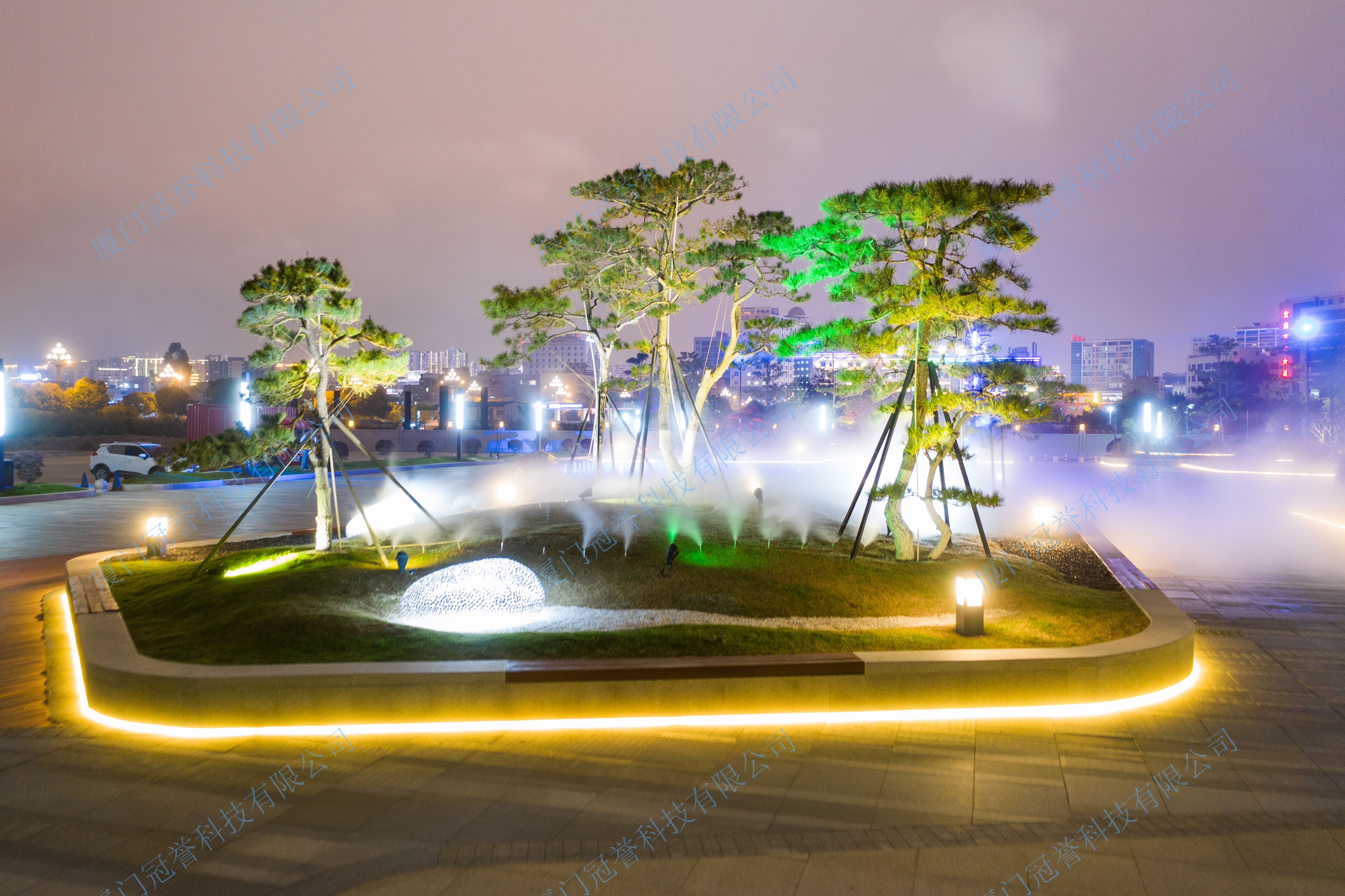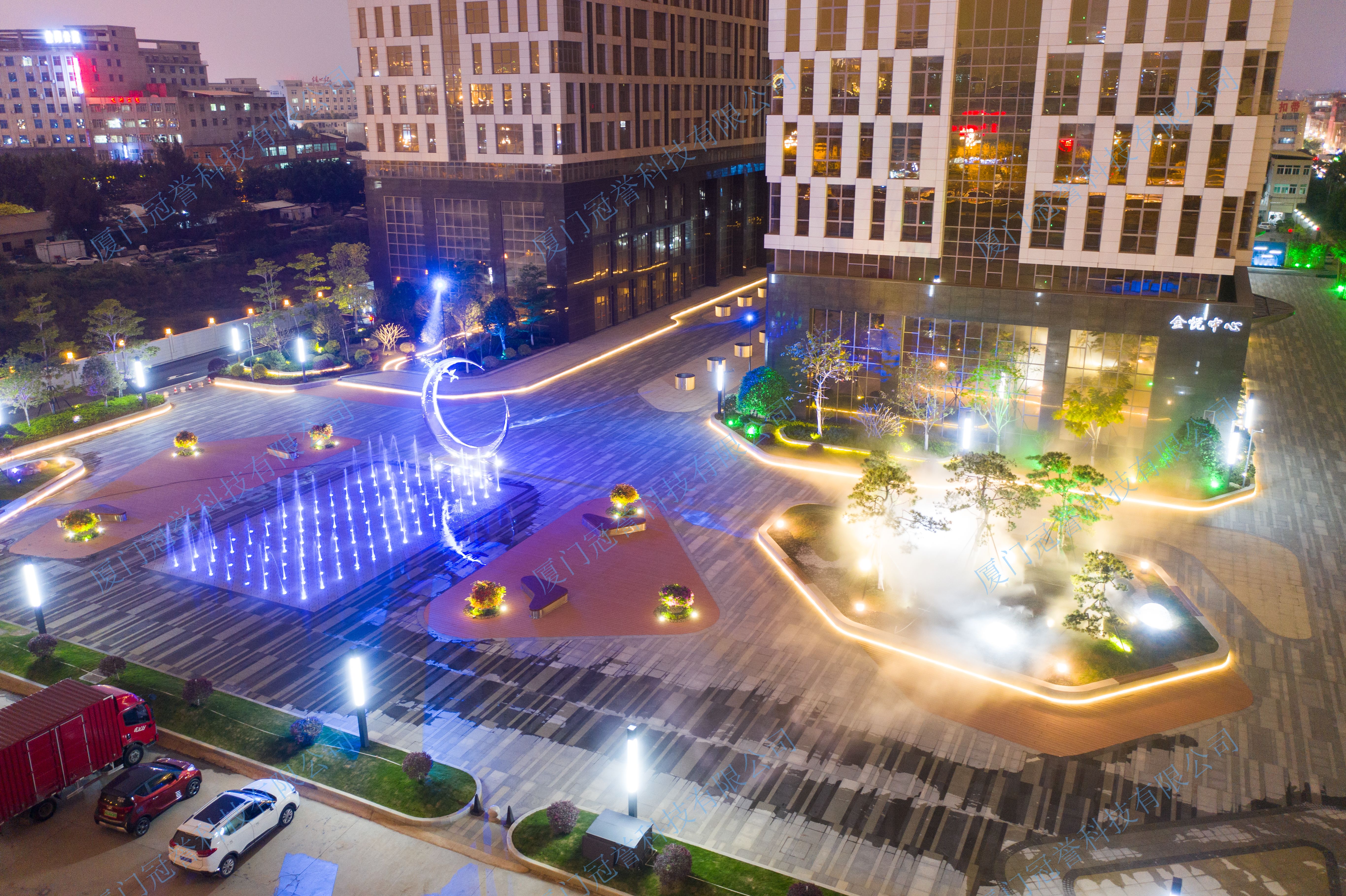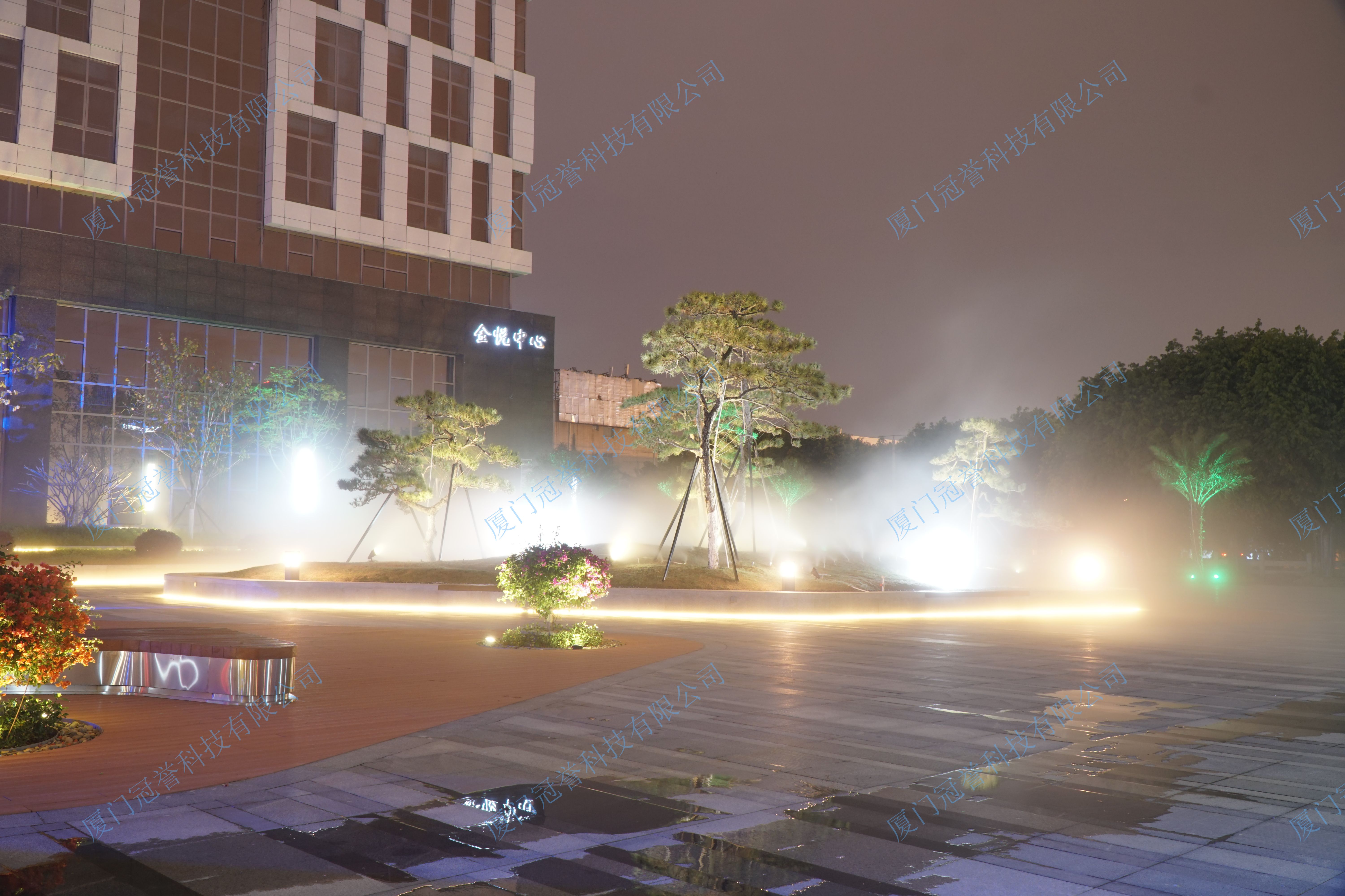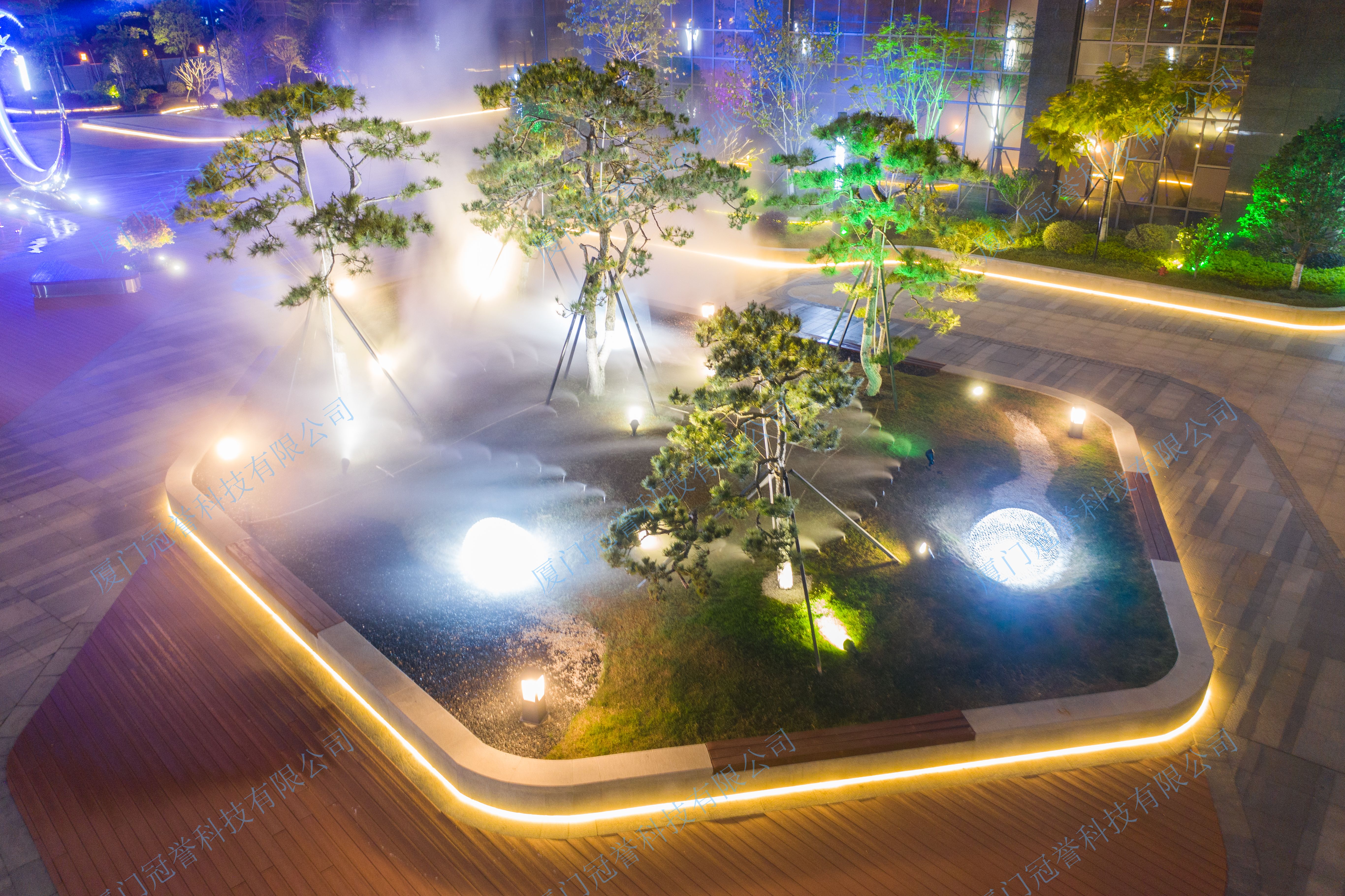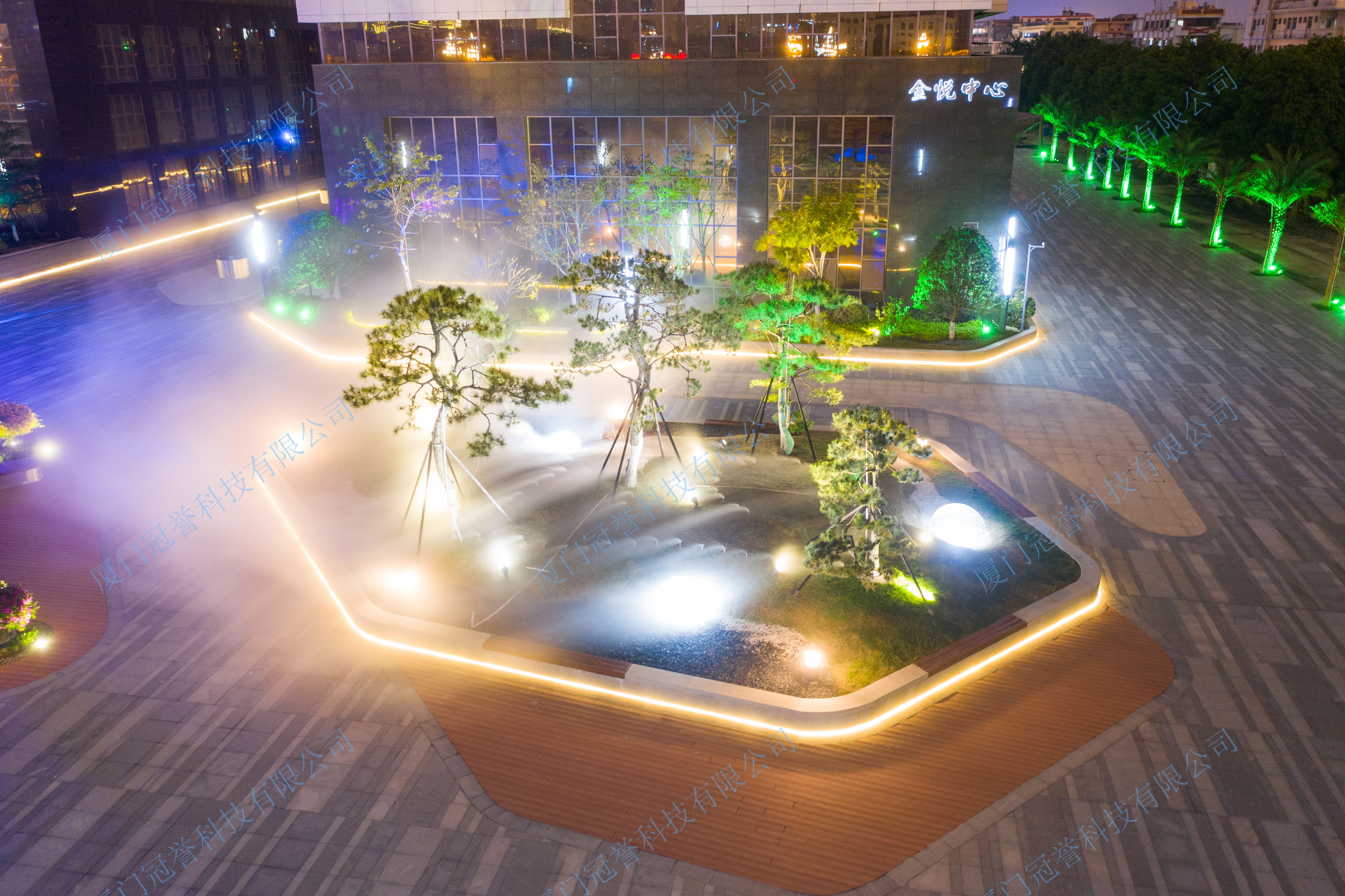 景观人造雾以改善空气质量,美化环境为依托,具有共同的景观效果,在景观设计中得到了普遍的运用。其增加了瀑布景观的气势,为连廊、休息亭营造休闲神秘的气氛,能够置身于茫茫雾海中呼吸潮湿新颖的空气,更可为金悦中心添上一分闲适的浪漫觉得。
