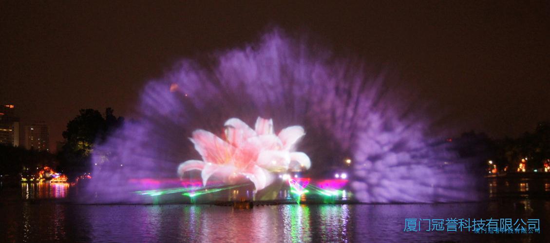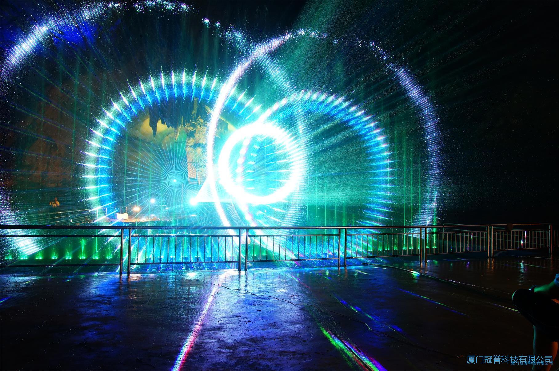 水幕激光电影系统是将激光器发出的激光束射在水幕喷头喷出的水膜上,激光束由激光控制系统编程控制,可发出多种多样的图案及色彩,照射在晶莹透明的水膜上,形成斑斓夺目的奇异效果。水幕电影出现于20世纪80年代,在国际上也仅在法国、日本等几个国家的大城市拥有。水幕电影采用特殊的入映机播放,使用的影片也是专门为水幕电影特制的影带。由于电影的屏幕是透明的水膜,因此在电影播放时会有一种特殊的光学效果,屏幕的视觉穿透性可使画面具有一种立体的感觉,影片的内容可与水面巧妙的结合,更有一种身临其境般的奇幻感觉。水幕电影是通过高压水泵和特制水幕发生器,将水自下而上高速喷出,雾化后形成扇形屏幕,由专用放映机将特制的录影带投射在“银幕”上,形成水幕电影。当观众在观摩电影时,扇形水幕与自然夜空融为一体,当人物出入画面时好似人物腾起飞向天空或自天而降,产生一种虚无缥缈和梦幻的感觉,令人神往。激光水幕电影主要由水幕发生器、投影机、激光组成。水幕高达8-20余米,宽15-50米,各种VCD光盘或水幕专用影片,均可在水幕上播放,影视效果奇特、新颖并是极佳的广告宣传工具,各种广场及阔旷的水面均可安装水幕电影。激光水幕电影广告比传统的广告更能吸引顾客,它色彩鲜艳、画面清晰、遥远可见,光束又能为城市夜空增色生辉。它可根据客户要求更换内容,公布最新消息;亦强轮流演示不同商家的广告。在形式上可动静结合、快慢相间、音响嘹亮、图方并茂,以新、特、奇的效果,给观众留下强烈的印象,是一种非常理想的广告手段。