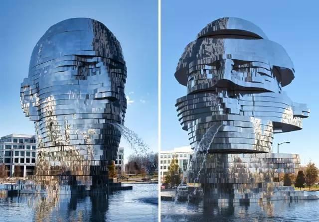 4、位于美国夏洛特市的金属变形镜像喷泉,堪称世界奇观,人像可歪曲扭动,生动不已。