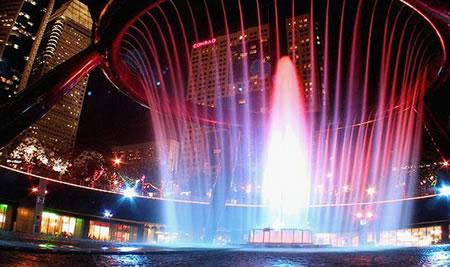3、在新加坡著名商业城区,新达城的地下建有世界上最大的喷泉——财富喷泉。它由铜铸的大型圆环以及起到支撑作用的4只长达66米的倾斜柱子组成。整个喷泉占据了一个周长为1683米的圆形区域,喷出的水柱更是高达30米。其圆形的设计象征完满的财富人生,这一设计的灵感源于印度教的曼陀罗,也传递了修建者渴望各种族友好相处,融合的愿望。