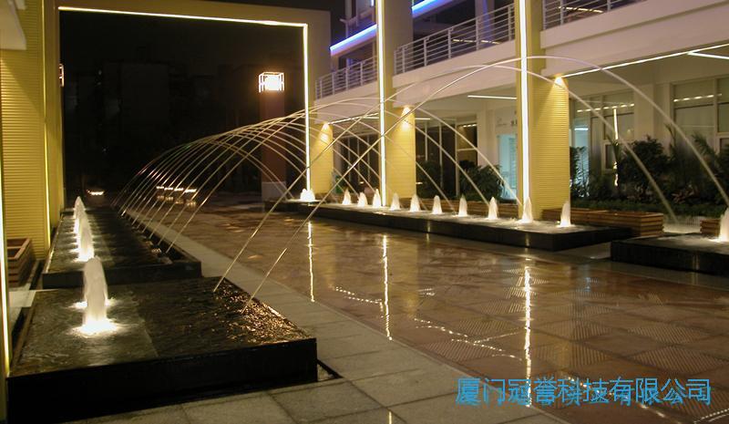 玻光喷泉,又名光亮泉,玻光喷泉在喷射时,水柱呈拱门状,整体光洁,水柱不溅不散,沿着设定的轨迹喷射,弧形波光水柱穿池而出,在空中挂起一道道幽雅的彩虹。大型波光喷泉跨度可达到8-10米,中小型波光喷泉跨度可根据需求设定,常用作喷泉景观构建组合,泳池水景陪衬组合等。玻光喷头可以产生没有震动的清澈水流,看上去就像一根6-12米长,直径为14 – 22mm的玻璃棒状水拄。使用低压内置高强度光源,光源跟随着水流,在夜晚整条水柱通体发光,恍若光纤,光随水泄,蔚为壮观!水流所到之处,装扮得异彩纷呈。